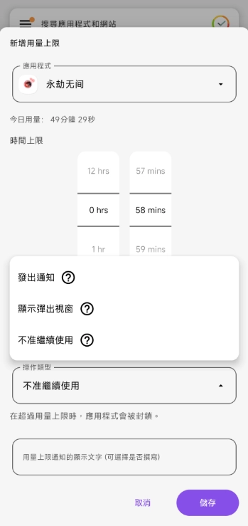 使用限制管理:设置应用使用时长限制,到达限制时自动提醒或屏蔽应用